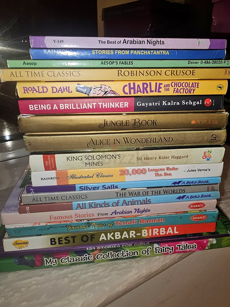 Selling a small collection of paperback fiction books suitable for kids and general readers. The set includes classics such as Charlie and the Chocolate Factory, Alice in Wonderland, Robinson Crusoe, The Jungle Book, The Best of Arabian Nights, King Solomon’s Mines and several other children’s story collections and classic tales.