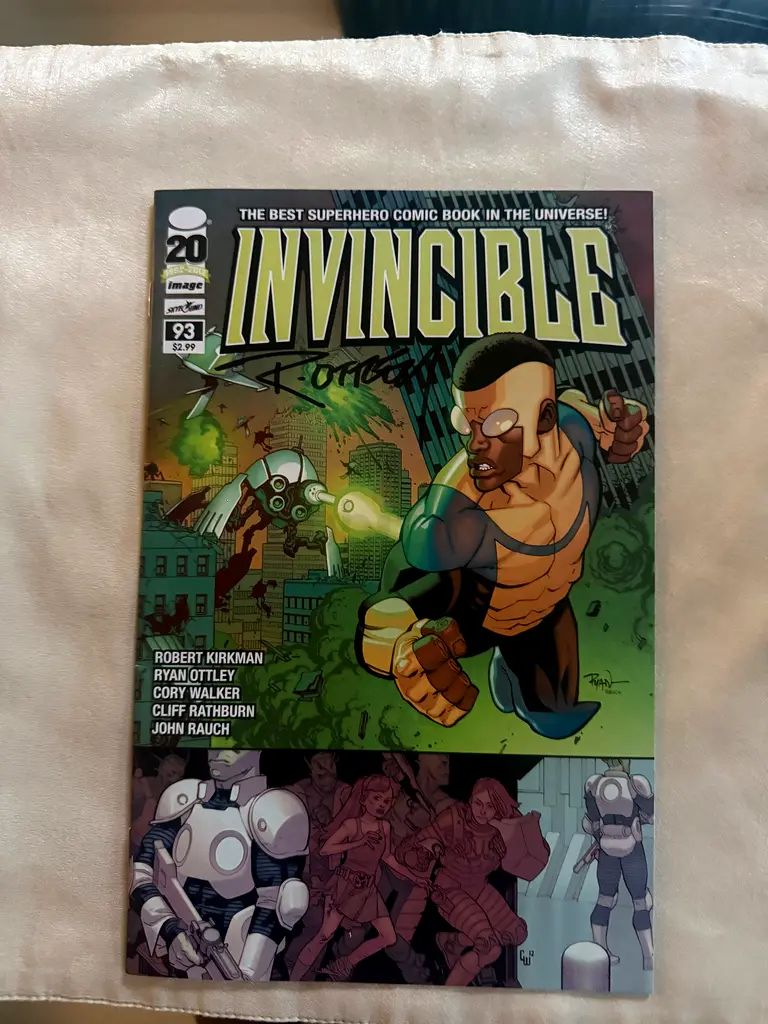 I'm selling my copy of Invincible #93 (Image Comics), a single-issue paperback comic from the series in perfect condition and signed by ryan ottley. The cover has a signature/marking visible in the photo. Pages are intact and clean from what I can see. Good for collectors who want a readable copy or to complete a run.