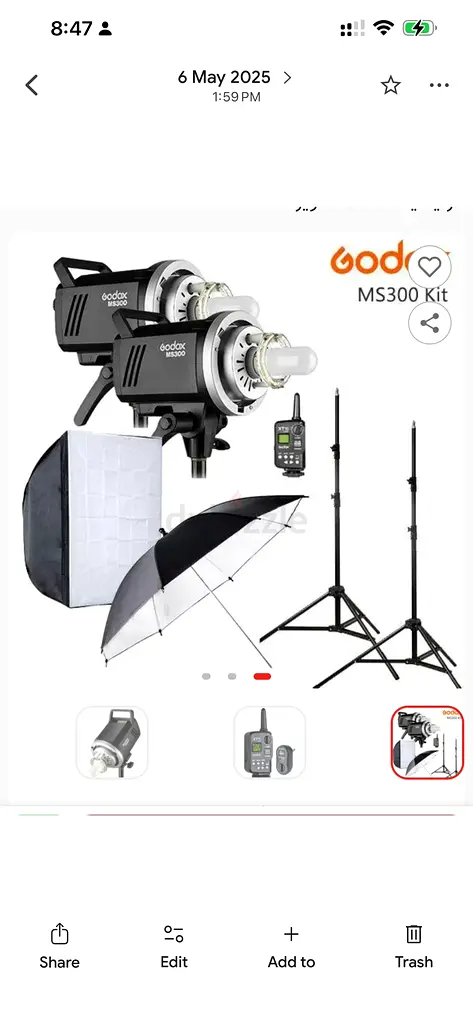 I am selling a Godox MS 300 kit that has been used only once and is in excellent condition. This kit comes complete with two powerful studio lights, light stands, softboxes, and an umbrella for creating soft, diffused lighting. Ideal for photography enthusiasts looking to improve their studio setup, this kit provides everything you need to enhance your shooting experience.