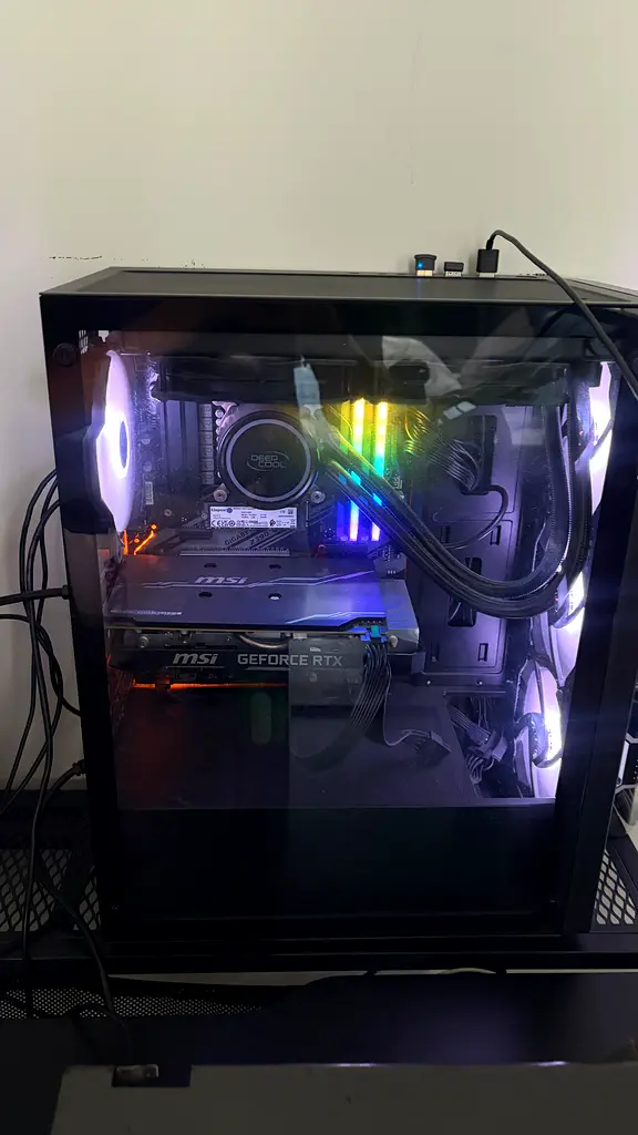 I'm selling my custom RGB gaming desktop. It's about 1–2 years old, used normally and in flawless condition. The build runs an Intel Core i7 with 32 GB RAM, an MSI GeForce RTX graphics card and an AIO liquid cooler visible in the photos. It has a 750–999 GB hard drive and outputs at 1920 x 1080 (HD). There is no warranty remaining. I'm listing it under Computers & Networking → Desktop Computers.