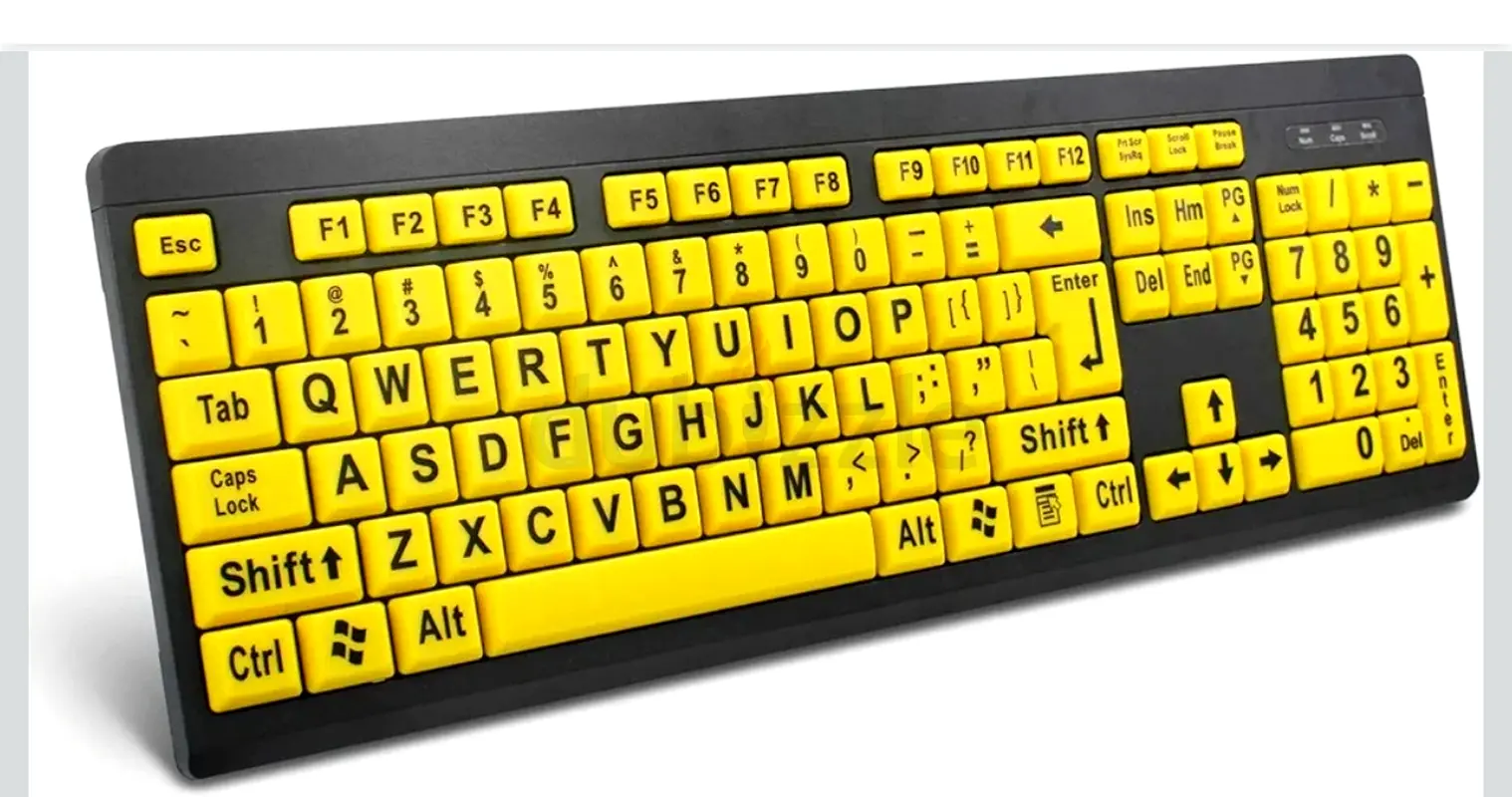 I'm selling a brand new AbleNet Large Print Computer Keyboard. This high-contrast wireless keyboard features large, easy-to-read keys that are perfect for those who may have difficulty seeing standard keyboard lettering. It’s never been used and is in flawless condition, making it an excellent addition to your computer setup. Not only does it look vibrant with its yellow keys and black background, but it also provides a comfortable typing experience.
