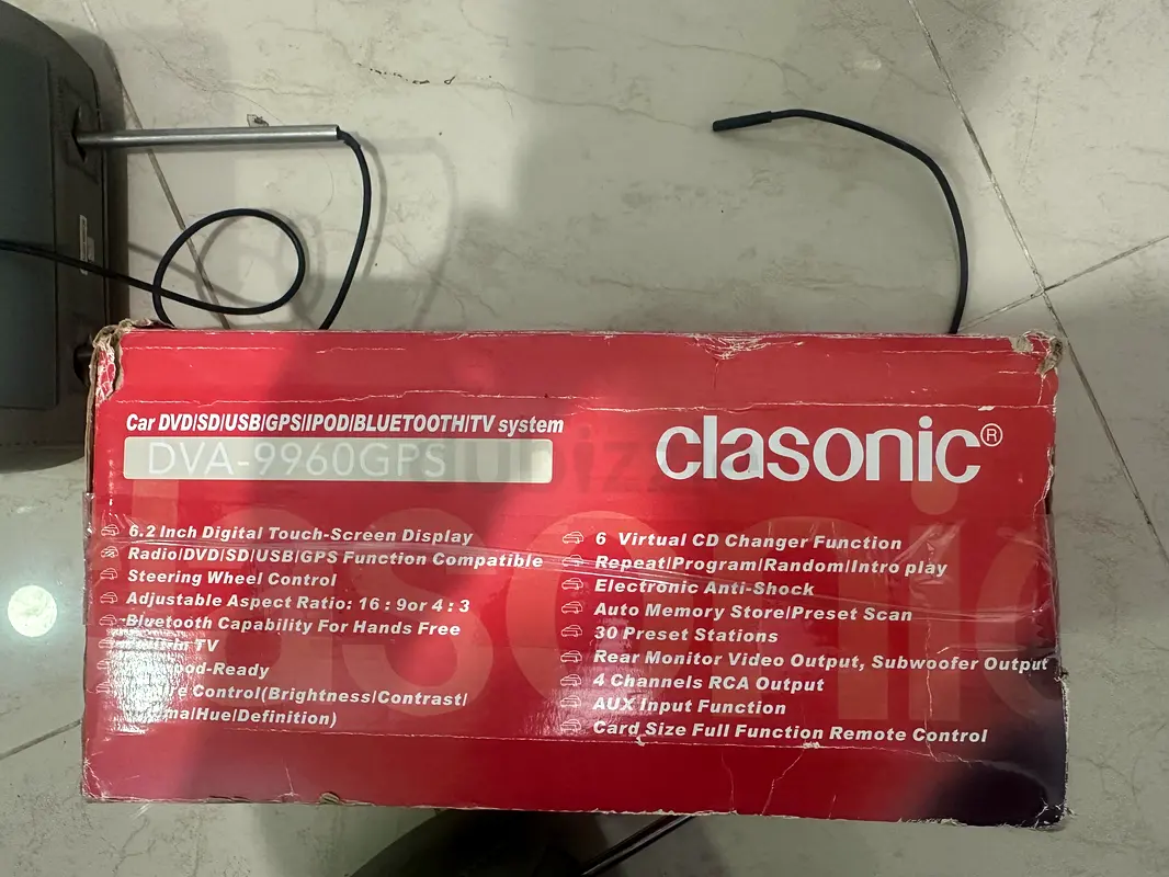 Specifications: - Model: Clasonic DVA-9960GPS - Screen: 6-inch Digital Touch Display - Features: GPS, Bluetooth, DVD/USB Compatibility - Type: Car Multimedia System - Warranty: None
