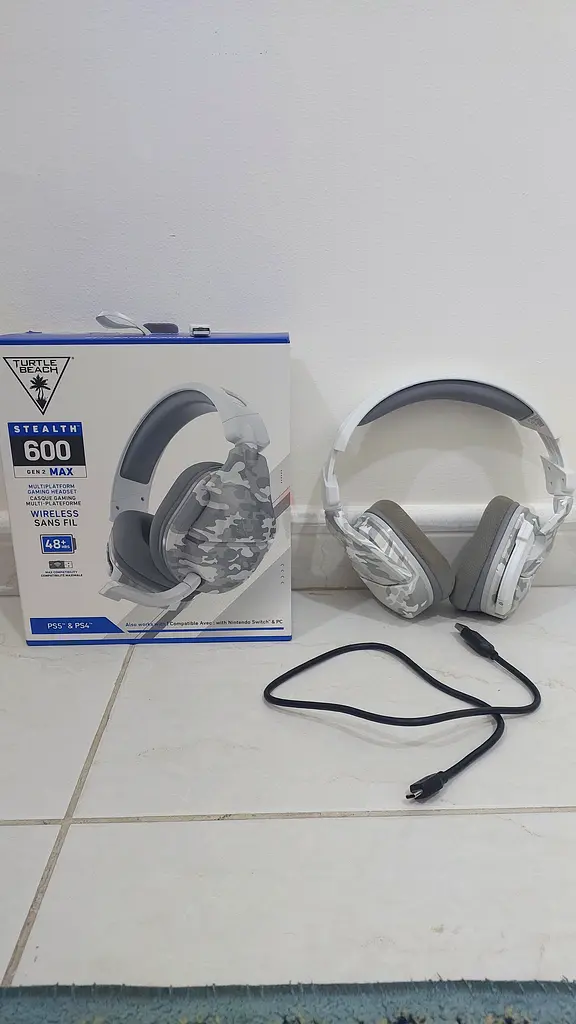 I’m selling my Turtle Beach Stealth 600 Gen 2 MAX wireless gaming headset. I bought it about a year ago and used it for casual gaming at home — overall it’s in good condition with normal signs of use. The headset connects wirelessly and still holds a solid connection. I’m including the USB wireless adapter, charging cable, and the original user manual. There’s no warranty left. The ear cushions and headband are intact and comfortable, and the microphone works fine for voice chat. Box is available as shown in the photos.