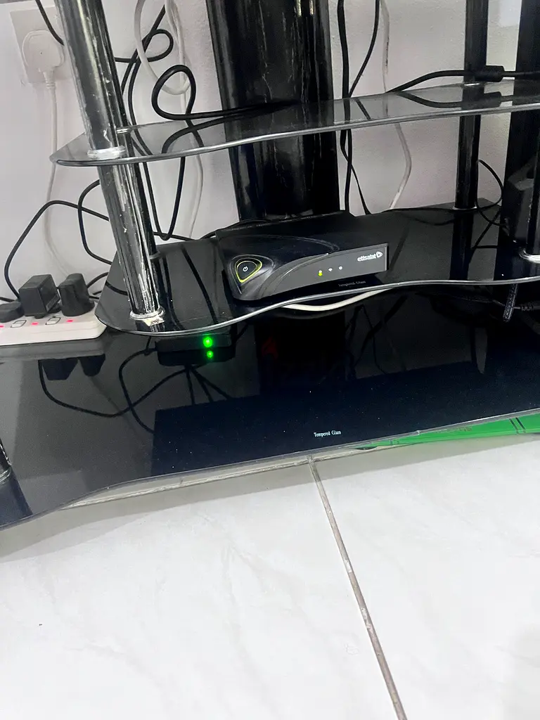 I’m selling a black glass TV stand in good condition, used for about 1–2 years with normal usage. It’s sturdy and holds my cable box and other small devices — see photos for the setup with a cable box and wiring. No warranty applies. Pickup only.