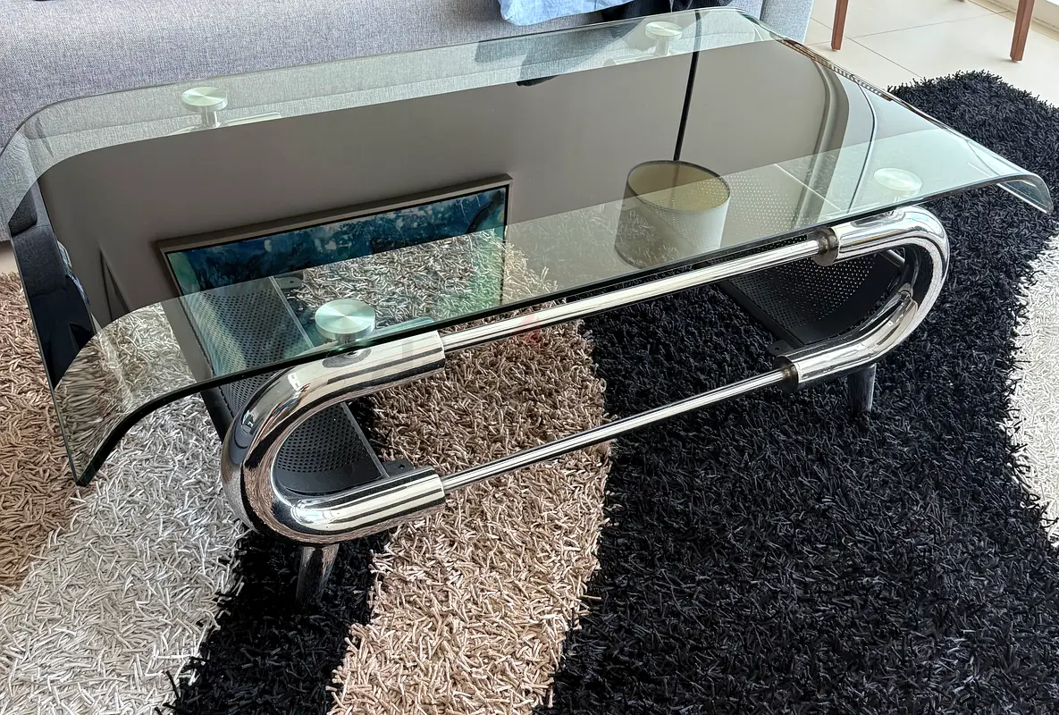 I'm selling a stylish clear glass bar table with a sleek chrome frame. It's perfect for two and has a rectangular shape that fits nicely in any space. The glass is in excellent condition, reflecting normal usage over the past 1-2 years. This table adds a modern touch to your home, whether you're using it for casual meals or entertaining guests.