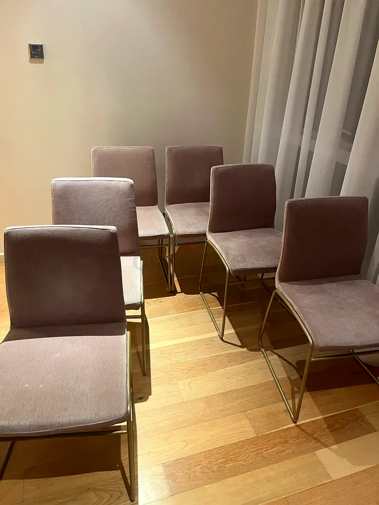 I'm selling an elegant set of 6 modern dining chairs from Home Center, designed to add a touch of sophistication to your dining area. These chairs are in good condition and have been used normally over the past 2-5 years, showing minimal wear while maintaining their beautiful pink color. The square shape of the chairs makes them a perfect fit for various dining table styles, bringing a contemporary flair to your home.