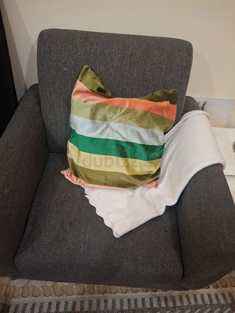 I'm selling my cozy gray armchair from Pan Emirates. It's about 1-2 years old and has been well taken care of, so it’s in good condition. The armchair features a lovely striped pillow that adds a pop of color and comfort. It’s perfect for adding a stylish touch to any room while providing a comfy spot to relax after a long day. Whether you're reading a book or watching your favorite show, this chair will make your space feel more inviting.