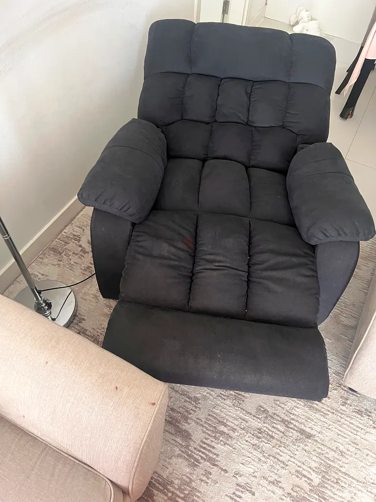 I'm selling a comfortable black recliner chair from United Furniture that's perfect for relaxing or napping. It's in good condition, having been used normally for the past couple of years. The plush cushioning and ergonomic design make it a great addition to any room where you want to unwind. Its sleek black color easily complements various home decor styles.