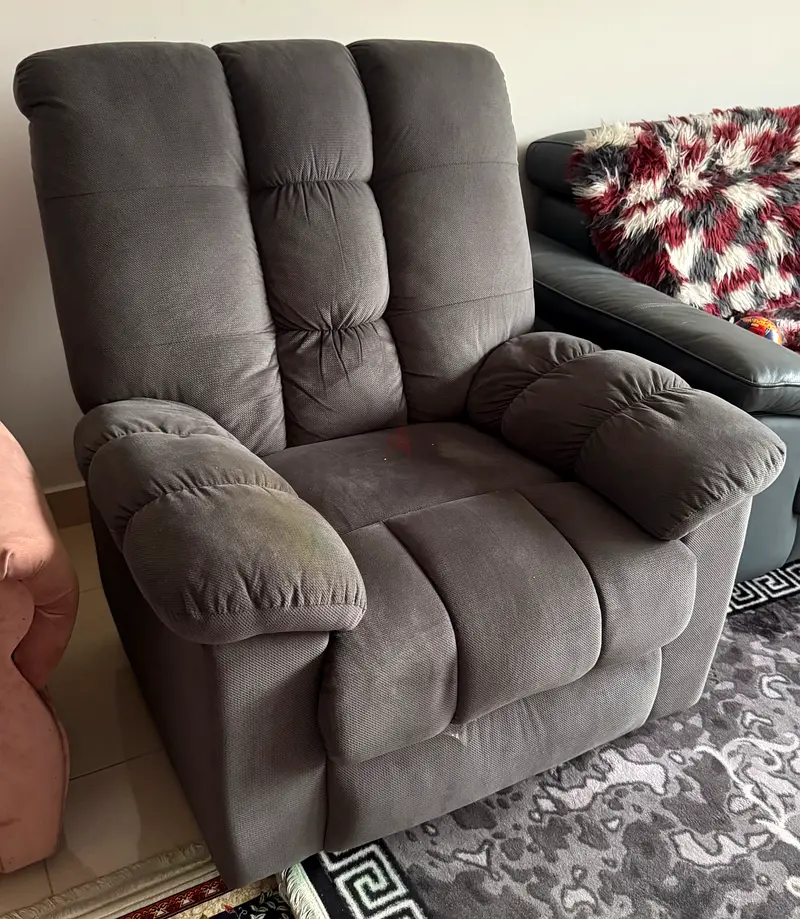I’m selling my grey plush rocking recliner armchair from Danube Home. It’s about 1–2 years old and has been lightly used, currently in excellent condition. The chair has deep padding on the seat and back with wide cushioned armrests and a soft grey fabric upholstery. It reclines and also offers a rocking function, comfortable for relaxing in the living room. No stains or visible damage and well maintained.