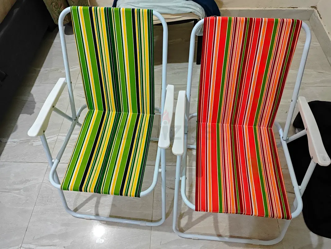 I’m selling a pair of Basics foldable outdoor chairs. They are brand new and have only light usage, currently in good condition. One chair has green/yellow striped fabric and the other has red/orange striped fabric, both with white metal frames and fixed armrests. They fold flat for easy storage and are suitable for patio, balcony, or outdoor events.