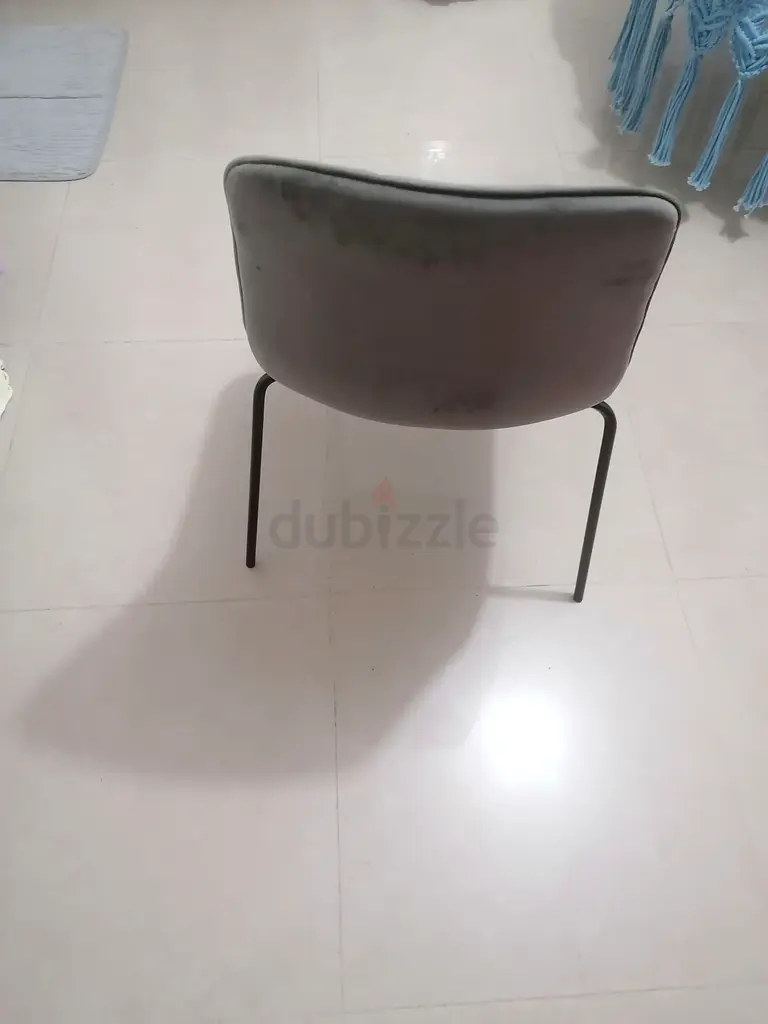 I am selling a Modern Velvet Chair from Home Center. It's gray in color and has been gently used, maintaining good condition despite normal usage. This chair features a sleek design that fits well in various home settings. Perfect for adding a touch of elegance to your living space.