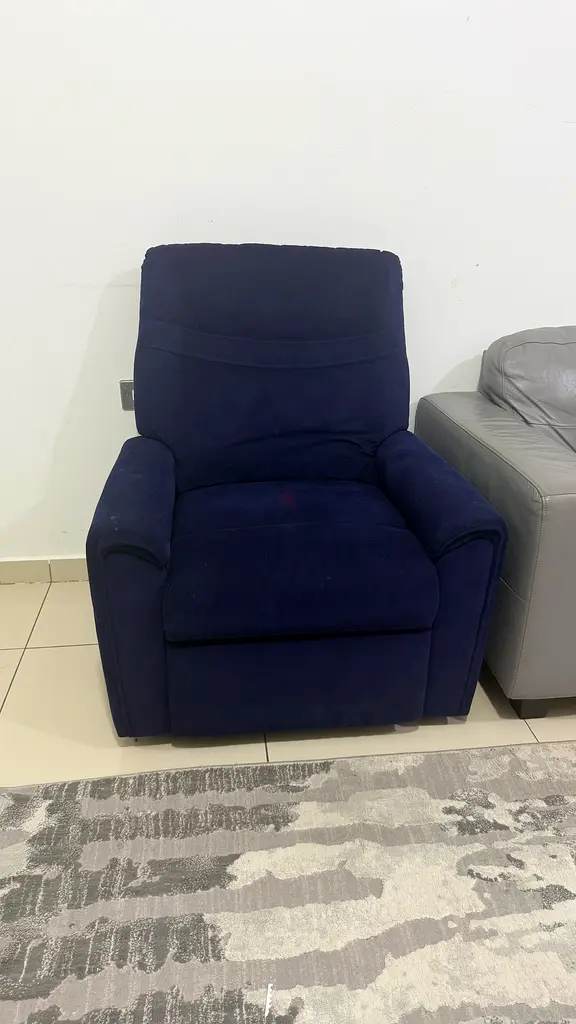 I am selling a comfortable navy blue recliner chair from Home Center. It is in good condition, with normal usage over the past 1-2 years. The chair is perfect for relaxing and unwinding after a long day. It has a soft fabric that feels great to sit on. Whether you need a cozy spot for reading or watching TV, this recliner will fit perfectly in your living space. set of two for 300