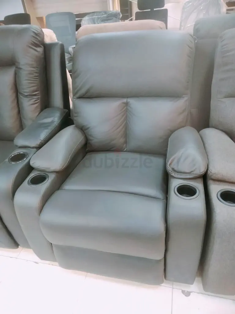I'm selling a single Classic Accessories leather recliner armchair in gray. It's brand new and has never been used, in excellent condition. The chair has a comfortable padded backrest, cushioned seat and armrests, and built-in cup holders on both armrests for convenience. It reclines smoothly for relaxing and is suitable for a living room or home theater setup. No stains, tears or marks — kept in showroom condition.