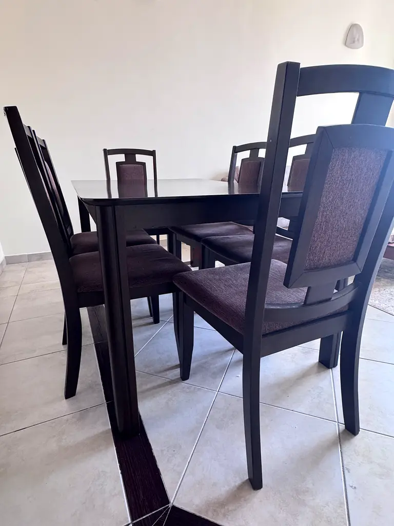 I'm selling a set of 6 dining chairs from Homes R Us in dark wood with brown upholstered seats and back panels. The chairs are about 2–5 years old and have been used under normal conditions; they remain in good condition with only light signs of wear like minor scuffs on the legs and slight fabric creasing from regular use. The seats are still comfortable and the frames are solid with no loose joints. They stack/align neatly under the dining table and match well with contemporary or transitional dining sets.