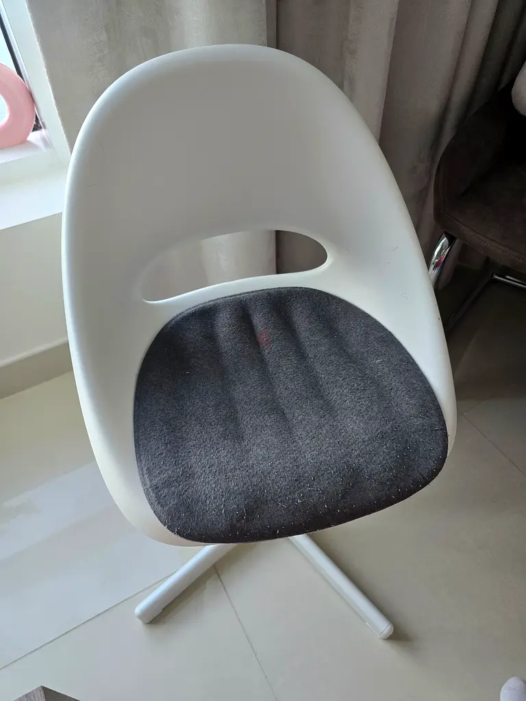 I’m selling a white IKEA kid’s chair in good condition. It has a rounded plastic shell with a cutout handle at the back and a removable dark grey cushioned seat pad. The chair shows normal light wear for its 5–10 years age but no cracks or structural damage. It’s stable and comfortable for a child’s room or play area.