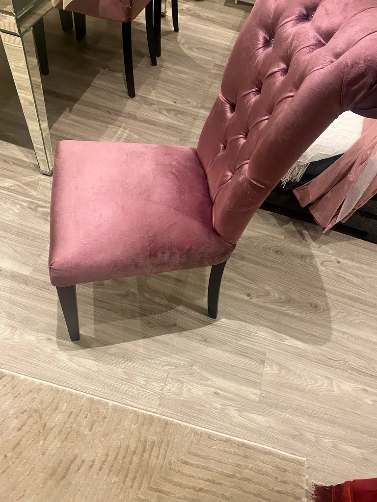 Original price 3600, I have an elegant pink upholstered dining chair from Home Center that’s in excellent condition. It’s just 1-2 years old and has seen light usage, making it a great addition to any dining area. The fabric has a soft texture and features a stylish tufted design, adding a touch of sophistication to your space. It's lightweight and easy to move around.