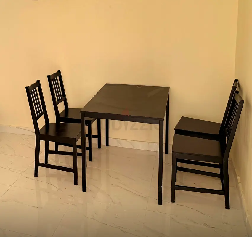 I'm selling a compact black dining table set by Classic Accessories. This set has been used for about 1-2 years and is still in good condition, with normal usage wear. It seats up to 4 people comfortably and features a sleek rectangular shape, making it ideal for small dining areas. Perfect for family meals or gatherings with friends.