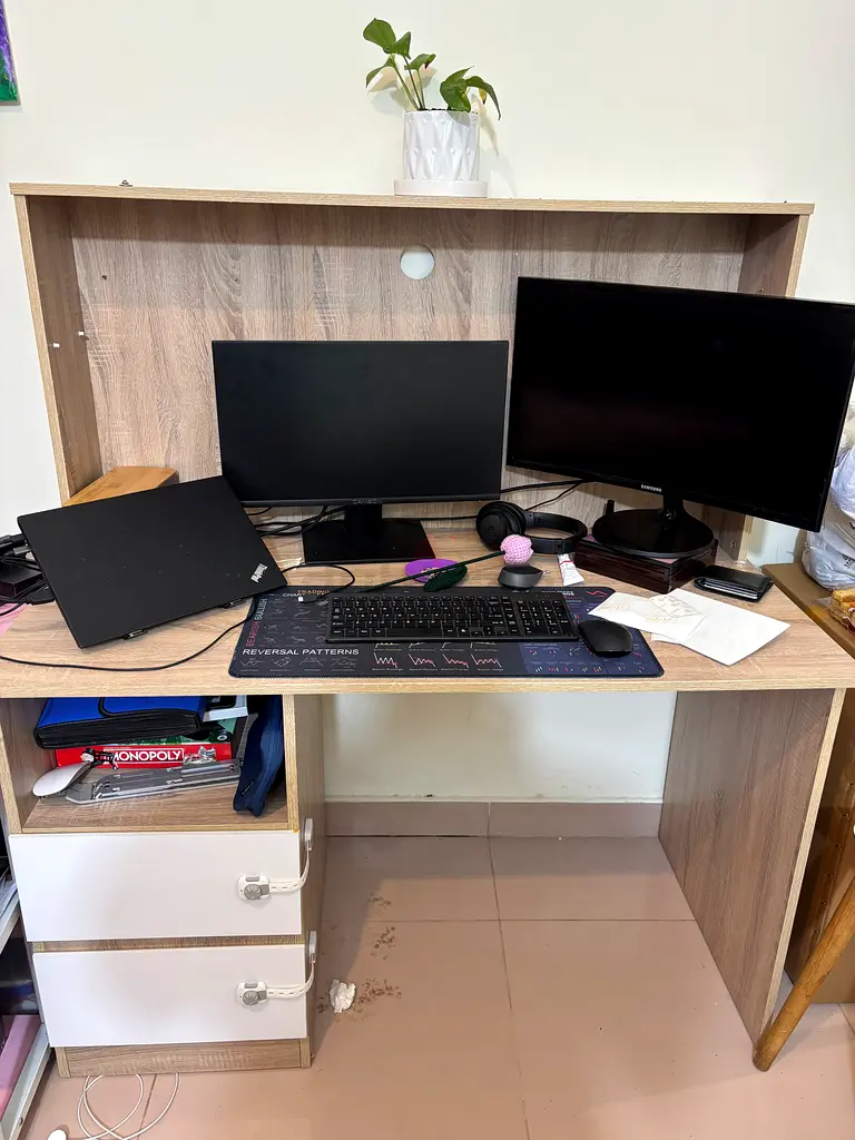 I'm selling this modern study desk that has served me well over the last few months. It has a stylish brown finish and features a practical rectangular shape. This desk is perfect for anyone looking to set up a dedicated workspace, especially if you work with multiple monitors, as it comfortably accommodates dual screens. The condition is good, showing normal usage wear but still very functional and attractive. It's compact enough for small spaces but spacious enough to hold your stationery, notebooks, and more. Ideal for students or anyone working from home!