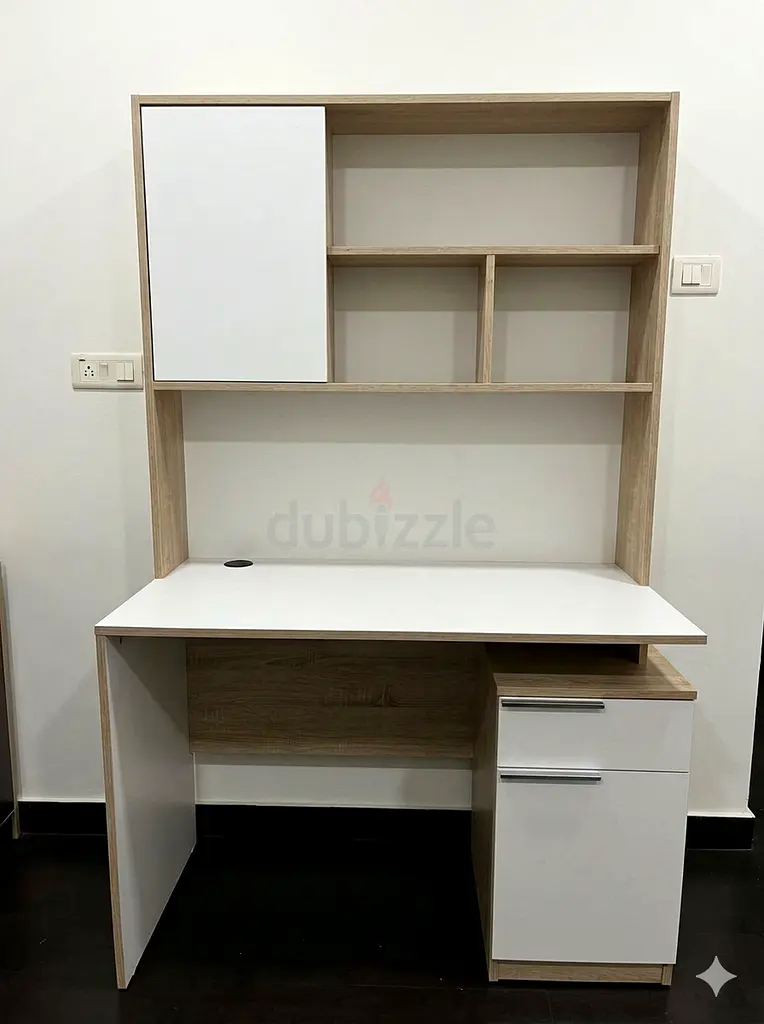 I'm selling a brand new modern study table that has never been opened. It's in flawless condition and features a clean white finish, making it a great addition to any workspace. The table has a rectangular shape and provides ample storage space with shelves and a drawer. Ideal for anyone looking for a stylish and functional setup.