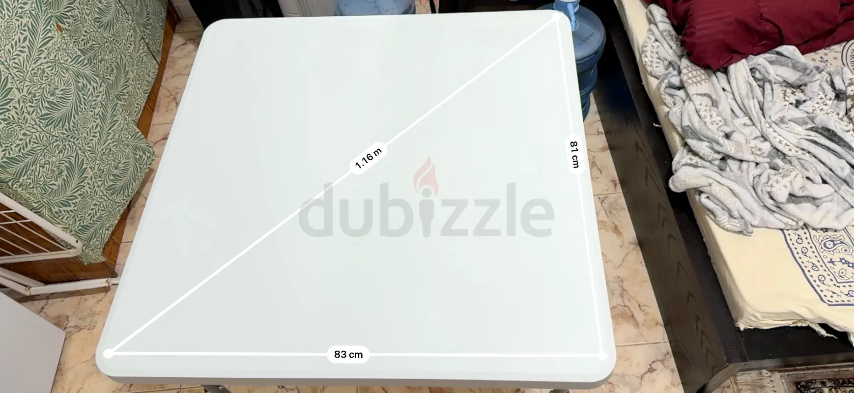 I'm selling a white Cosmoplast folding plastic table I used only once. It's a compact square table (83 x 83 cm) with a simple, practical design and a folding mechanism that makes it easy to store and move. The table is about 1months old and in good condition with no visible damage or stains. It comfortably seats up to 4 people for casual dining, homework, or light outdoor use. Legs fold flat underneath for convenient storage and transport.