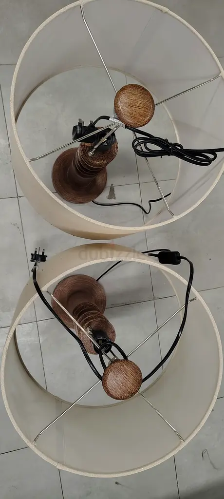 I’m selling a pair of wooden table lamps with cream fabric drum shades. I’ve used them for about 1–2 years and they’re in good condition with normal signs of use. The bases are solid wood with a natural finish and the shades are beige/cream fabric that diffuse light softly. Both have working cords and standard plug fittings; one cord has an inline switch. No chips or major scratches on the wood, and the shades have no stains or tears. Suitable for bedside tables, living room side tables, or desks.