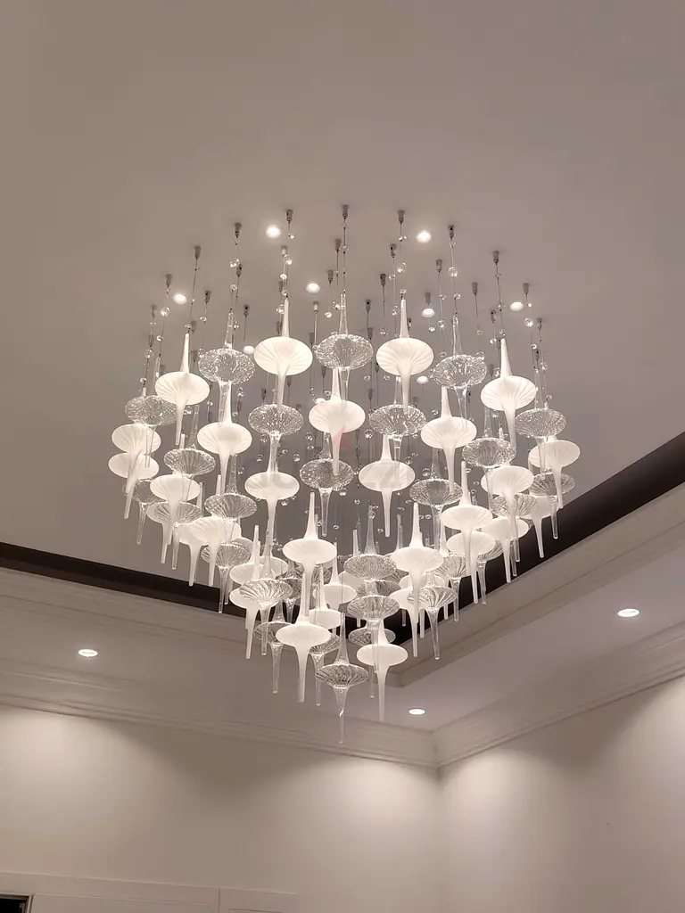 I'm selling a large modern glass chandelier that I had installed but never used. It's brand new and in excellent condition. The fixture is a sculptural ceiling light made up of multiple suspended white glass elements with clear glass accents, creating a soft, diffused ambient glow. It's ceiling-mounted and ideal for a living or dining room where you want a contemporary focal piece.