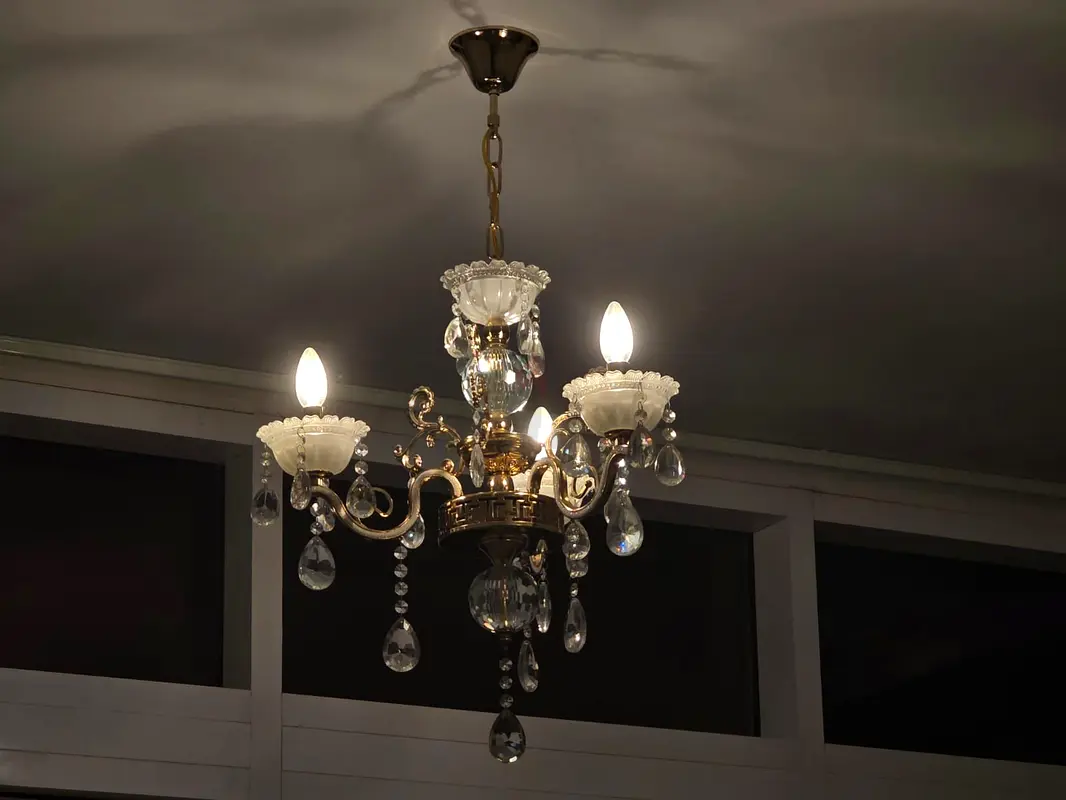 I'm selling a vintage 5-arm crystal chandelier in good condition. It's a gold-finish ceiling fixture with glass/crystal drops and decorative glass bobeches that diffuse light nicely. The chandelier has normal wear from 5–10 years of use, all arms and hanging crystals are intact and it lights up well on standard bulbs (sold with fixture only). Suitable for dining room, living room or entryway. Comes wired for ceiling mounting; bulbs not included.