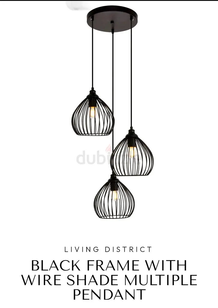 I'm selling a black wire-frame triple pendant light that I bought about 1–6 months ago. I used it only once and it's in good condition. It has three hanging wire-style shades on a single round ceiling canopy and comes as shown in the photos.