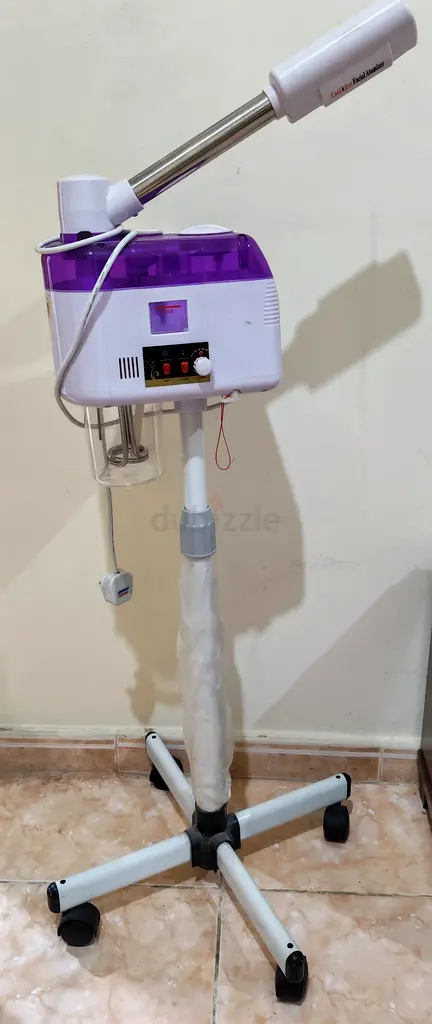 I am selling a professional facial steamer with Ozone on an adjustable rolling stand. It is brand new, never used and in excellent condition. The unit is white with a purple water tank and includes the articulated steam arm, glass accessories, and height-adjustable metal stand with caster wheels for easy movement. It has no warranty. Ideal for spa or home beauty treatments, it produces warm steam for facial cleansing and hydration. Selling because I no longer need it.