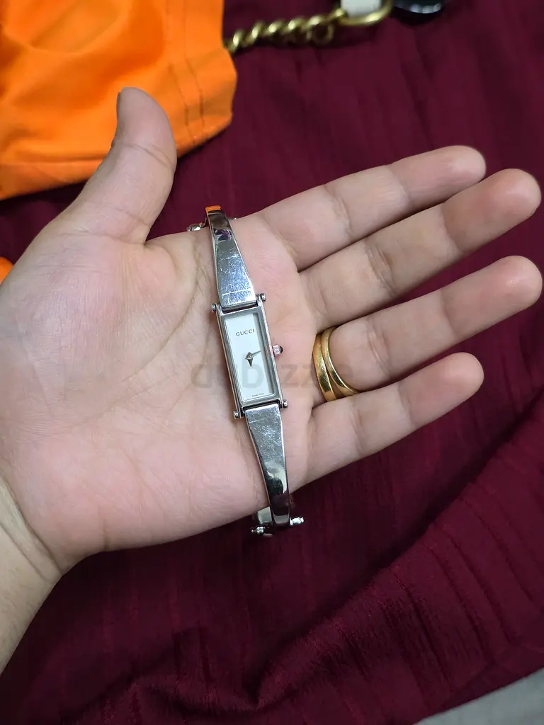 I'm selling my silver bangle women’s watch — slim rectangular face, good condition. I’ve had it for about 2–5 years and used it under normal usage. It has a slim rectangular white dial and a stainless steel bangle-style band in silver. The watch is from an other/non-branded maker and is made of steel. It shows normal signs of wear but is in good condition overall.