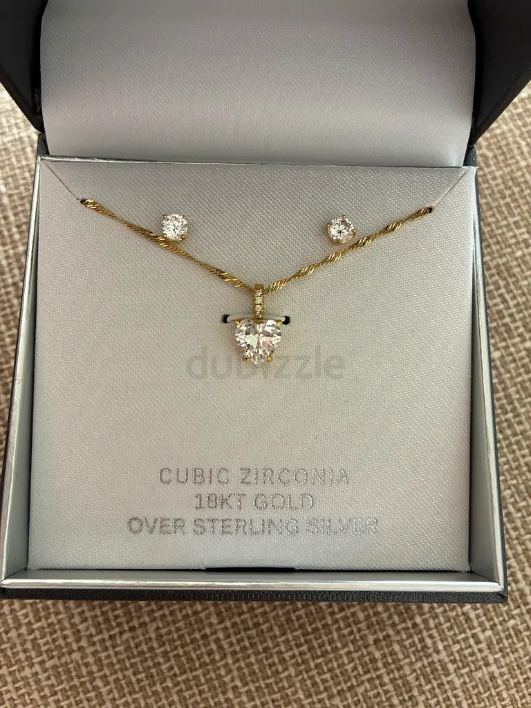 I’m selling a brand new, never worn 18K gold over sterling silver necklace and stud earrings set with cubic zirconia stones. The set includes a delicate twisted gold-plated chain with a central pear-shaped CZ pendant and two matching round CZ stud earrings. Metal: 18K gold plating over sterling silver; stones: clear cubic zirconia. Condition is flawless and comes in its original box. Perfect for everyday wear or special occasions.