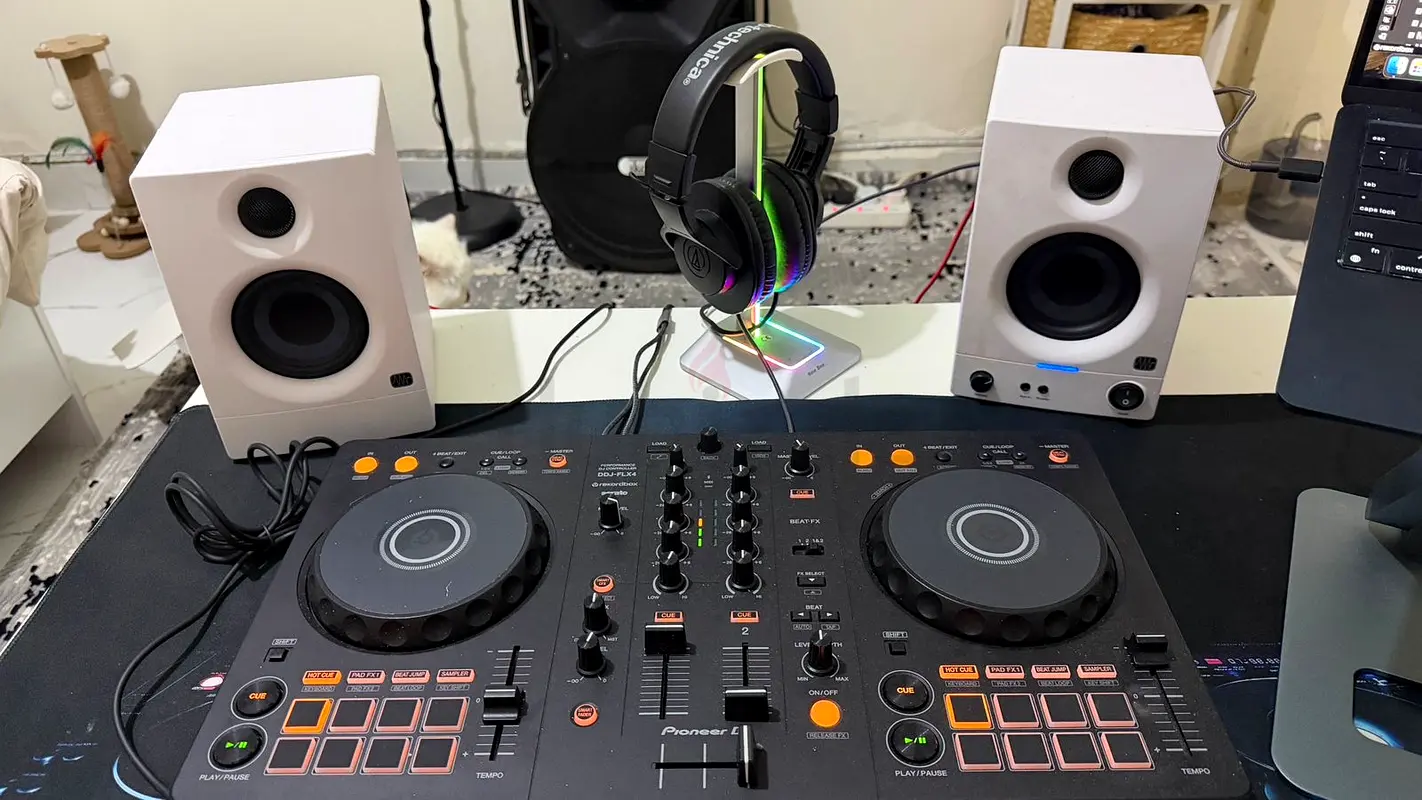 I'm selling my compact DJ controller bundle — I've used it lightly for about 6-12 months and it's in flawless condition. The controller is a two-deck layout with jog wheels, performance pads and a central mixer section, and it connects to a laptop via USB (cable included). The bundle also includes a pair of white studio monitors with front controls and a comfortable over-ear wired headphone set with LED lighting on the stand. Everything works perfectly and I’m only parting with it because I’m
