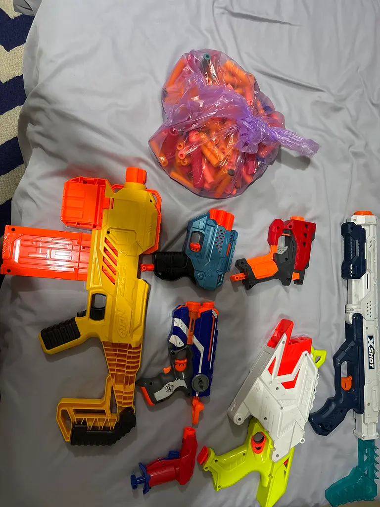 Selling a set of assorted Nerf blasters along with a bag of darts. These toys are perfect for kids aged 5-13 years and provide hours of fun. All blasters are in good condition and have been used normally. This bundle includes various models, allowing for different styles of play. Ideal for outdoor games and friendly competitions with friends.