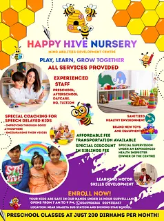 We are providing best services in affordable fee.Daycare, babysitting,preschool,KG are available.We have an offer now,300 dhs/month for regular weekly five days preschool classes.This is a limited time deal,so enroll fast... Location is near to sh