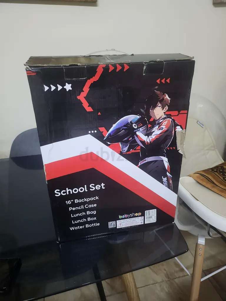 I'm selling a brand new Babyshop school set that has never been used and is still in its original box. The set includes a backpack, pencil box, and lunch box—everything suitable for kids aged 2-4 years and 5-7 years. The items are in good condition (new) and come from Babyshop. The box shows some minor wear from storage but the contents are unused.