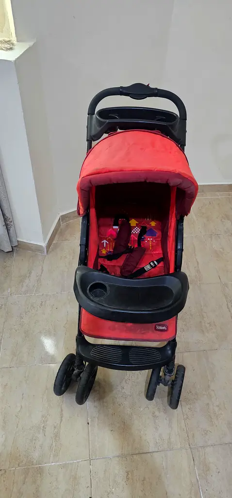 I'm selling a red stroller that's perfect for your little one. It's in excellent condition and has been used normally for about 1-2 years. This stroller features an extended canopy to provide extra sun protection, a convenient storage basket for essentials, and multiple recline positions for your child's comfort. It also comes with cup holders to keep drinks within reach. This is an ideal choice for parents looking for a reliable stroller for toddlers.