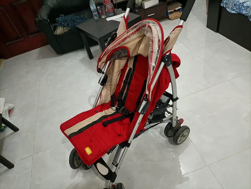 I'm selling my Babyshop red lightweight stroller. It's in good condition and has been used normally. The stroller is 2-5 years old and is suitable for children aged 2-4 years. It comes with a canopy and durable all-terrain wheels, so it's good for outdoor walks on different surfaces. I'm including it as shown in the pictures — clean and functional, no major damage.