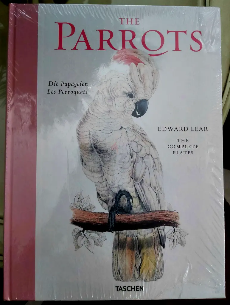 كتاب The Parrots من إصدار دار TASCHEN، وهو كتاب فني يحتوي على رسوم توضيحية كلاسيكية للببغاوات من أعمال الفنان Edward Lear.