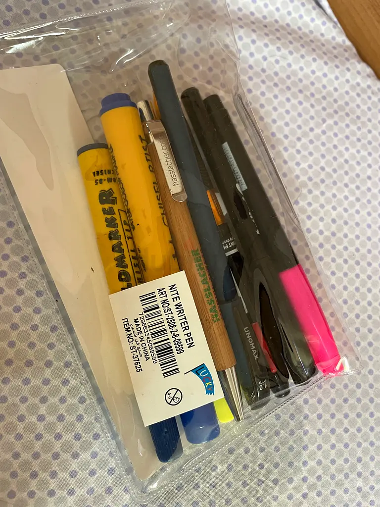- Pack contents: assorted ballpoint pens, highlighters, permanent marker, pencil