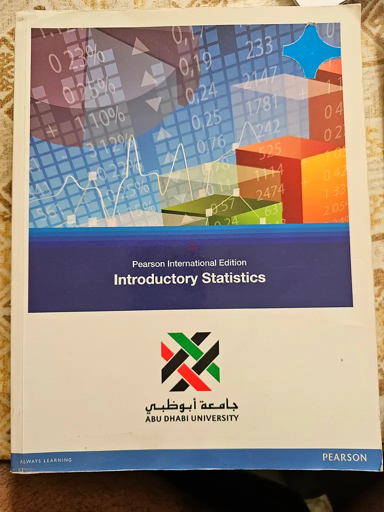 I'm selling my Introductory Statistics textbook (Pearson International Edition) used for Abu Dhabi University. It's a paperback I bought about 1–2 years ago and has seen light use. The book is in excellent condition — cover and pages are well kept with minimal wear. It's the university-level edition and suitable for coursework or self-study.