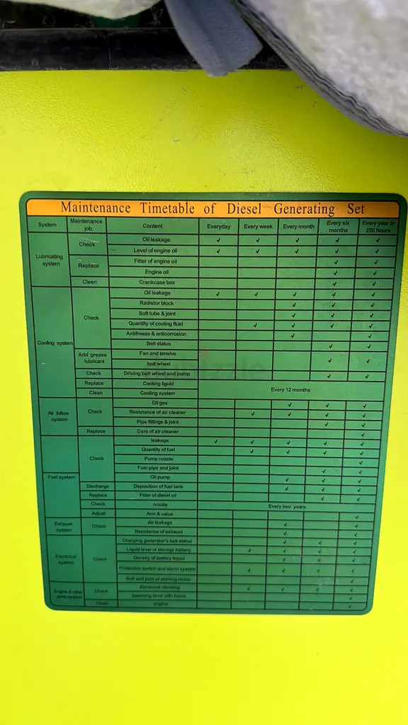 I'm selling a generator that has never been used and is in flawless condition. This generator is perfect for business and industrial applications, providing reliable power when you need it most. It features a detailed maintenance timetable for diesel cleaning, ensuring that it is well-maintained and efficient for use. Don't miss out on this opportunity to acquire a brand new generator that can greatly benefit your operations.