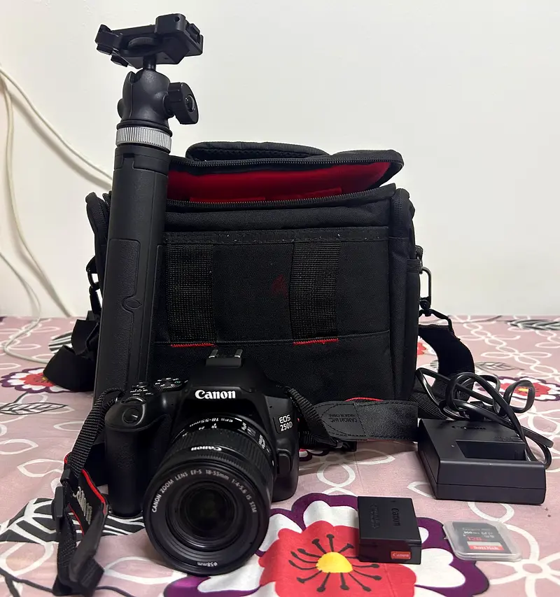 I'm selling my Canon EOS 250D camera kit, which comes with all the essential accessories. This camera is in flawless condition and has been gently used for only about 6-12 months. It includes a sturdy camera bag, a tripod for those steady shots, a battery charger, and an extra memory card for capturing all your precious moments. The Canon EOS 250D is perfect for both beginners and enthusiasts who want to step up their photography game. It’s lightweight and easy to handle, making it ideal for travel. I have the original bill and box as well for added confidence in your purchase. Don't miss out on this fantastic deal!