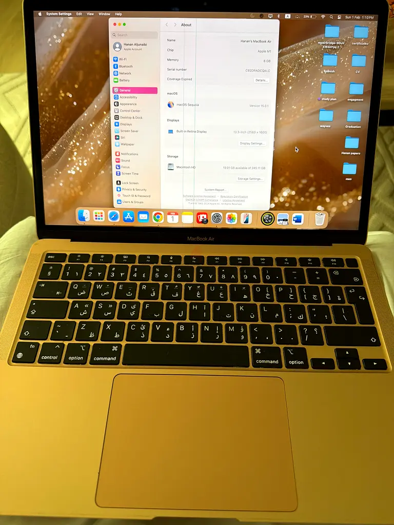 I'm selling my MacBook Air M1 in Gold, which I've lovingly used since 2021. It's in good condition and has been my reliable companion for work and play. The stunning Quad HD display resolution of 2560 x 1600 pixels brings everything to life, making it perfect for streaming and productivity tasks. With 8 GB of RAM and the impressive Apple M1 processor, it handles multitasking smoothly and efficiently.