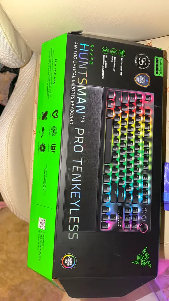 I'm selling my Razer Huntsman V3 Pro Tenkeyless RGB Gaming Keyboard, which is in flawless condition and has only been used once. This keyboard features vibrant RGB lighting, providing an amazing visual experience while you game or work. The