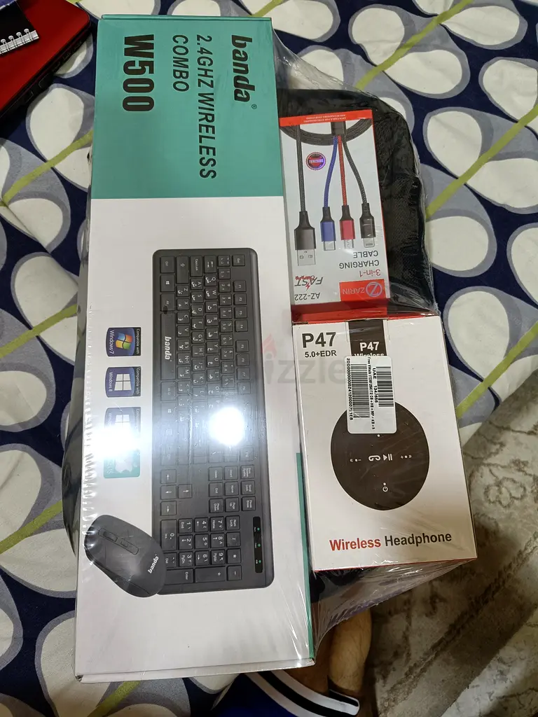 I'm selling this fantastic combo that includes a brand new wireless keyboard and mouse, a stylish wireless headphone, and a 3-in-1 charging cable, all conveniently packed in a stylish backpack. The condition is flawless, and I've never actually used any of the items. Each component is still in its original packaging, ensuring you get everything just as it was when purchased. This set is perfect for anyone looking to upgrade their tech setup with top-notch accessories.