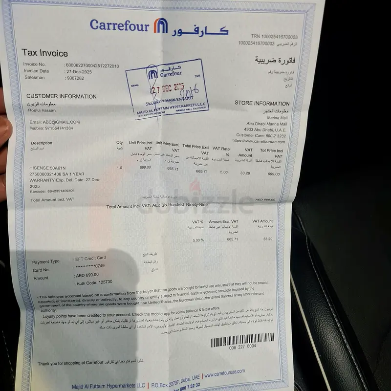 I am selling the original Carrefour tax invoice/receipt. It is a flawless, never-used original document showing purchase details, store information, VAT breakdown, and official Carrefour stamps. The paper is in excellent condition with all text and barcodes clearly legible. Suitable if you need an original proof of purchase or for warranty/return purposes.