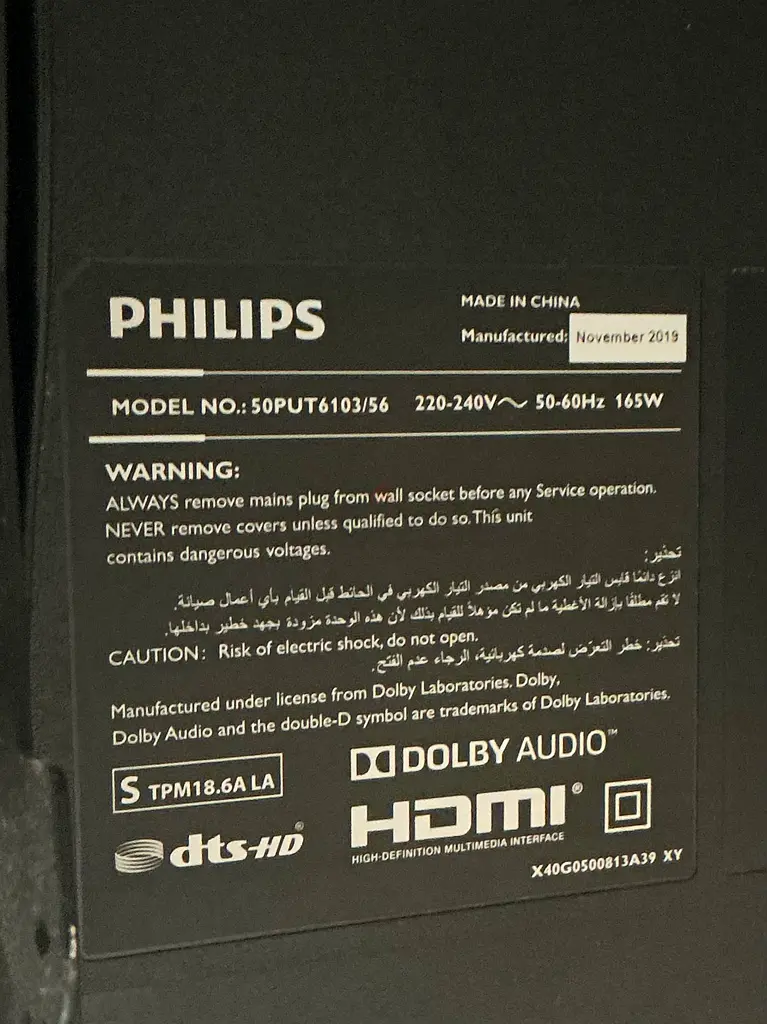I'm selling my Philips 50PUT6103/56 50-Inch 4K UHD TV. This television has been well taken care of and is in excellent condition, perfect for watching your favorite movies and shows. It features a stunning UHD 4K resolution for crystal clear picture quality. The screen size is 50 inches, making it a great addition to any living room or entertainment space. It is designed for wall mounting, providing versatility in setup. The TV was manufactured in November 2019, and I've only used it with normal usage since then. Please note that there is no warranty applicable.