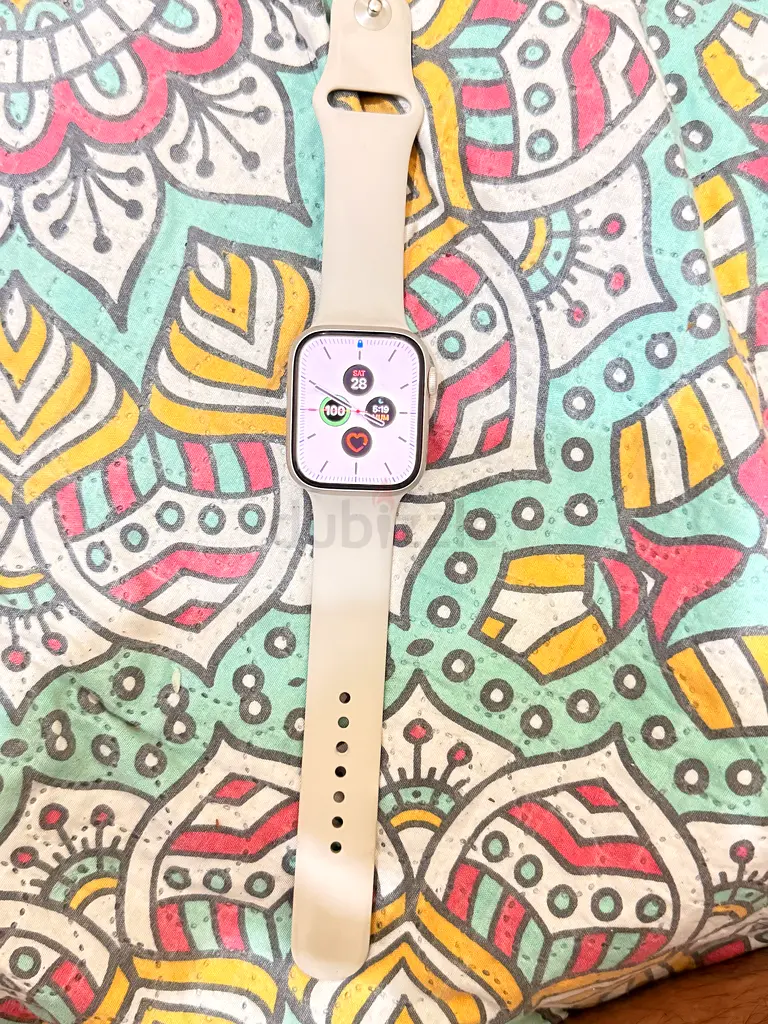 I'm selling this stylish smartwatch that's in excellent condition. It has been gently used and is perfect for keeping track of your fitness and notifications on the go. The watch features a simple design with a light-colored strap and a vibrant display making it easy to check the time or your stats at a glance.