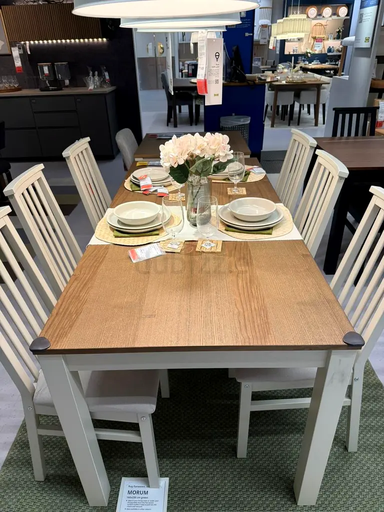 I'm selling an elegant dining table set from Ikea that is brand new and has never been used. This beautiful set, perfect for a modern dining room, features a rectangular table and comes with chairs that can comfortably seat six people. The table showcases a stylish combination of brown finishes, adding a warm touch to your dining area. It’s in flawless condition and ready to enhance your home.