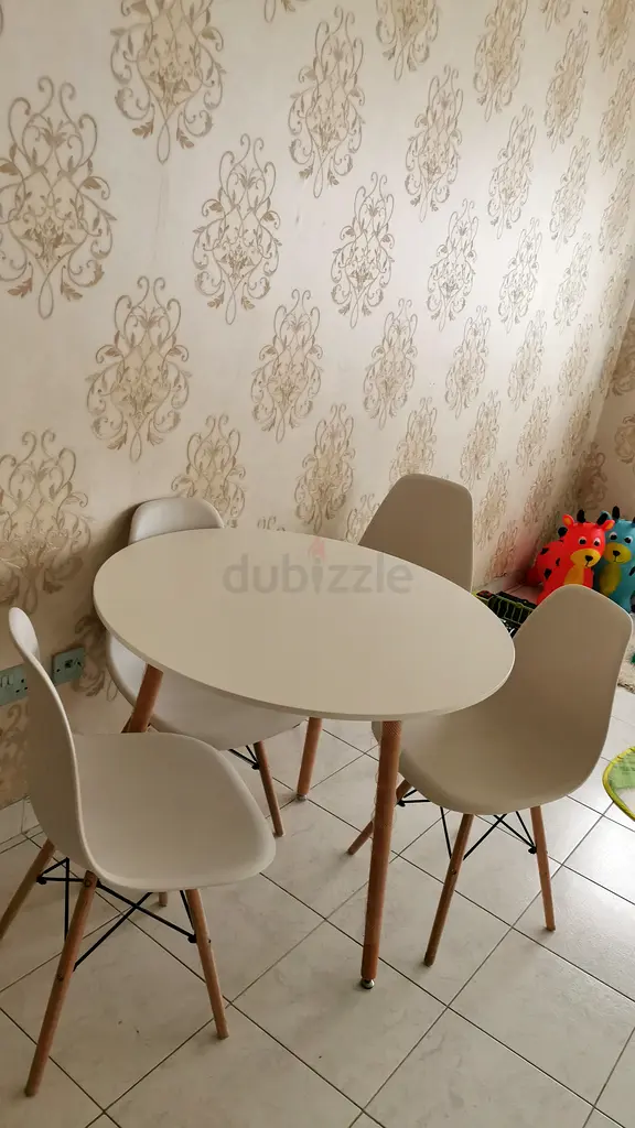 I'm selling a modern round dining table with chairs from Pan Emirates. It's in good condition and has been used normally. The table and chairs are white, making it a nice addition to any dining space. It has a seating capacity of four, perfect for family meals or gatherings. The round shape is ideal for creating a cozy dining atmosphere.
